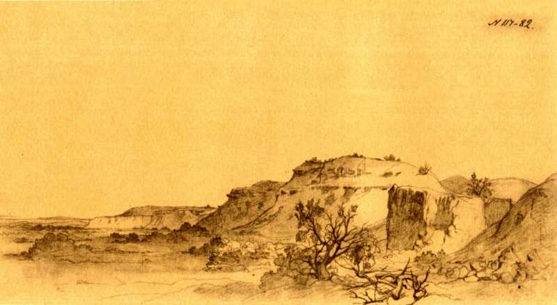 Taras Shevchenko. Mountainous coast of Nicholas island. Stained paper, pencil (15,7 × 28,9 cm). [Nicholas island]. [12 – 21.IX 1848; 22 – 30.VIII 1849]. Taras Shevchenko National Museum, inv. g – 565.