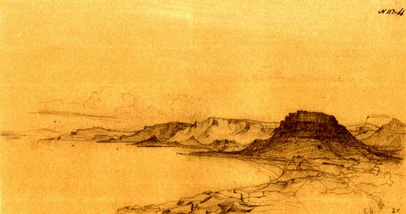 Taras Shevchenko. Rocky shore of Aral Sea. Stained paper, pencil (15,8 × 29,3 cm). [30.VII – 23.IX 1848; 6.V – 22.IX 1849]. Taras Shevchenko National Museum, inv. g – 485.