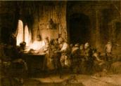 Etching of oil paintings by Rembrandt "Parable of the workers in the vineyard."