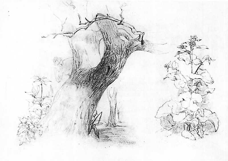 Т. Г. Шевченко. Дерево. Этюд к композиции «Нарцисс и нимфа Эхо». Растения. Этюды. [1840 – 1841, летние месяцы. С.-Петербург). Бумага, карандаш. 17,7 × 26,3 см. Национальный музей Тараса Шевченко, № г-772.