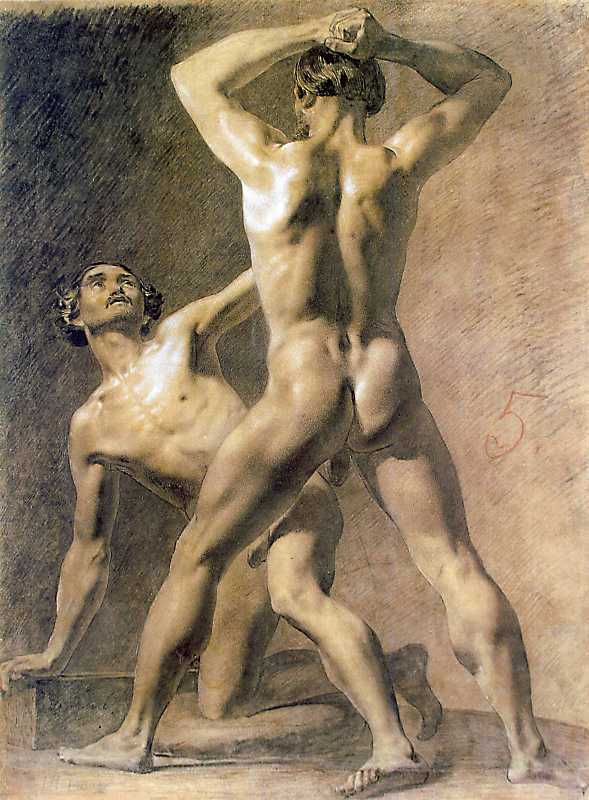 В двухфигурной композиции, которую учащиеся рисовали на третичном (за треть года) экзамене, натурщики поставлены в позу борцов. Натурщик, что оперся на колено, рисован с Ефрема, а изображенный со спины – вероятно, с Мартиана [Дневник художника А.Н. Мокрицкого / Составитель, автор вступительной статьи и примечаний Н.Л. Приймак. – М., 1975. – Табл. 29].