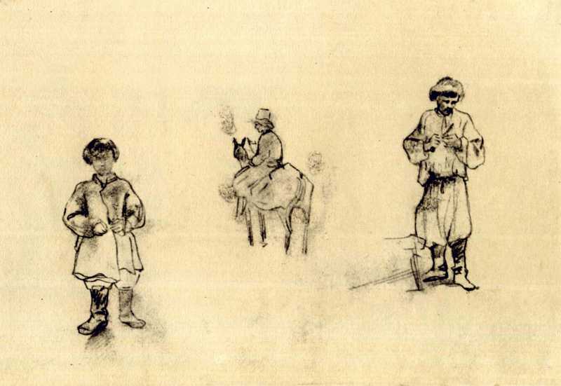 Т.Г.Шевченко. Фигуры крестьян. Наброски. Бумага, карандаш (20,4 × 30,2 см). [Июль – август 1846]. Национальный музей Тараса Шевченко, инв. № г – 641.