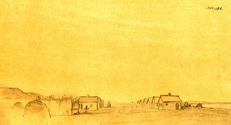 Т.Г.Шевченко. Станица Николаевская. Тонированная бумага, карандаш (16,1 × 29,4 см). [Новопетровское укрепление]. [1851 – VII 1857]. Государственный музей Т. Г. Шевченко АН УССР, Киев, инв. № г – 550.