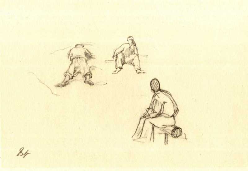 Аналогичные наброски крестьян и крестьянской одежды см. № 92, 93, 103, 106. Справа внизу – фигура на бревне. Подобную фигуру см. № 75.