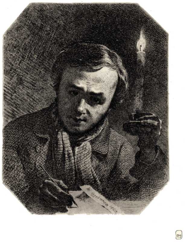 Т. Г. Шевченко. Автопортрет со свечой. [СПб.] [Не ранее VI] 1860. Бумага, офорт, акватинта 16.4 × 13; 22.5 × 16.2; (43 × 31.1 см).