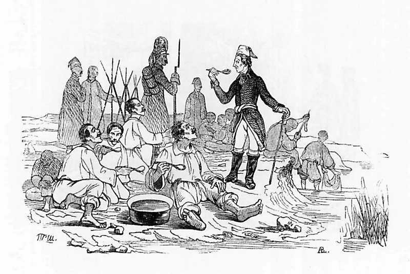 Рисунок не связан с текстом книги. К.В. Широцкий считал, что солдаты изображены Шевченко как украинские крестьяне. Это видно из их одежд, ибо мысль художника всегда витала в родной Украине [Широцкий К. Т. Шевченко как иллюстратор // Шевченковский сборник. – СПб., 1914. – Т. 1. – С. 106].