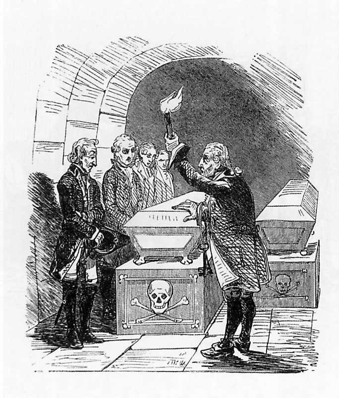 Иллюстрация к тексту на страницах 296 – 297 книги. Речь идет о том, как, возвращаясь из Швейцарского похода, Суворов посетил склеп в Нейтитшене (нине Новый Йичин), где похоронен его современник, австрийский генералиссимус Лаудон. «Своды, – писал К.В. Широцкий, – заставляет вспомнить аналогичную стену в той пещере, где Шевченко посадил своего монаха-капуцина» [Широцкий К. Т. Шевченко как иллюстратор // Шевченковский сборник. – СПб., 1914. – Т. 1. – С. 106] в гравюре «Католический монах».