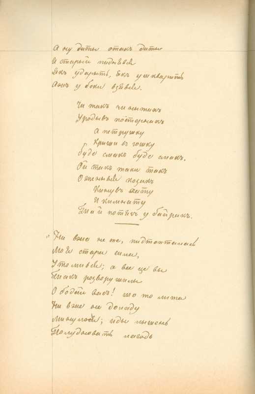 Альбом Тараса Шевченка «Три літа». С. 100 – продовження поеми «Сліпий» з рядка «Ану, діти, отак, діти…» |