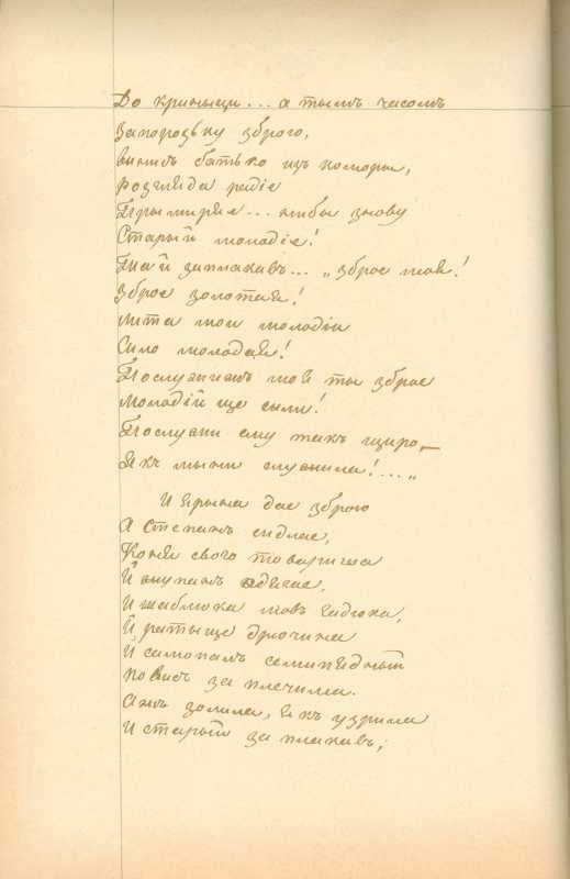 Альбом Тараса Шевченка «Три літа». С. 108 – продовження поеми «Сліпий» з рядка «До криниці… А тим часом…» |