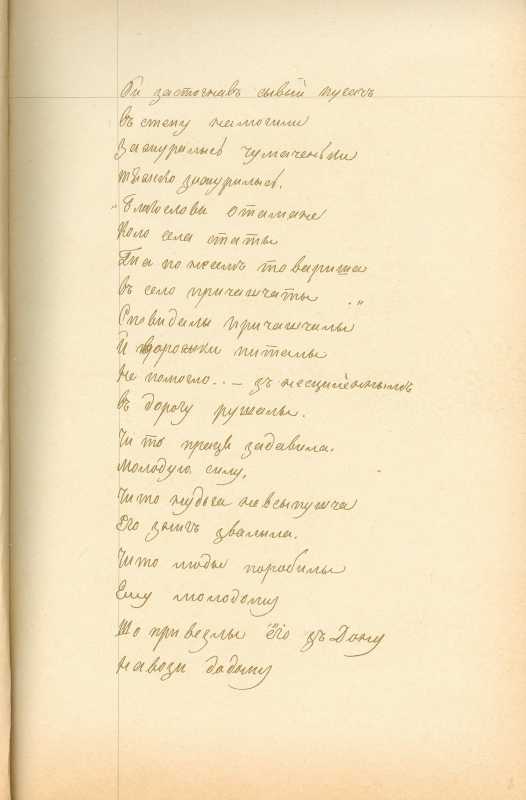 Альбом Тараса Шевченка «Три літа». С. 13 – продовження поезії «У неділю не гуляла…» з рядка «Ой застогнав сивий пугач…»