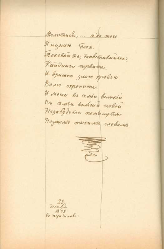 Альбом Тараса Шевченка «Три літа». С. 201 – закінчення поезії «Заповіт» з рядка «Молитися… а до того…»