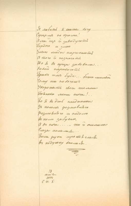 Альбом Тараса Шевченка «Три літа». С. 39 – закінчення поезії «Дівичії ночі» з рядка «Я любить, я жити хочу…»