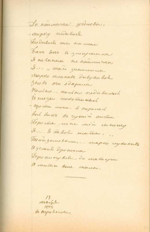 Альбом Тараса Шевченка «Три літа». С. 64 – закінчення поеми «Наймичка» з рядка «До наймички у голови…»