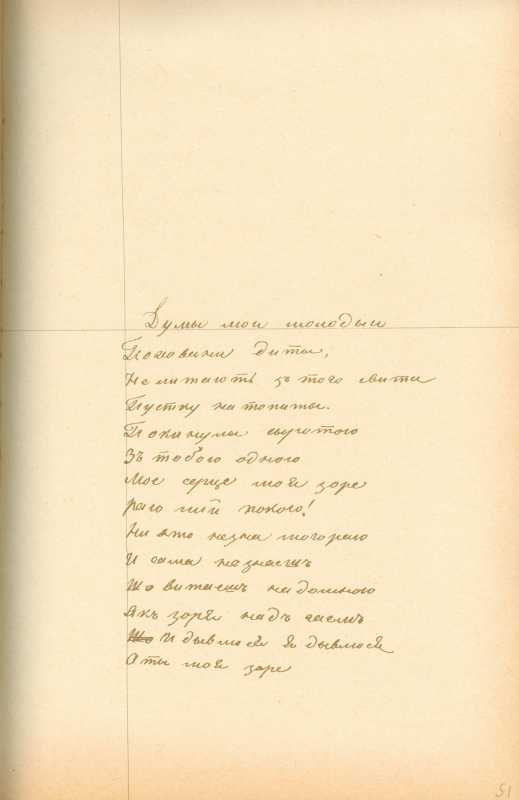 Альбом Тараса Шевченка «Три літа». С. 95 – початок поеми «Сліпий» з рядка «Думи мої молодії…»