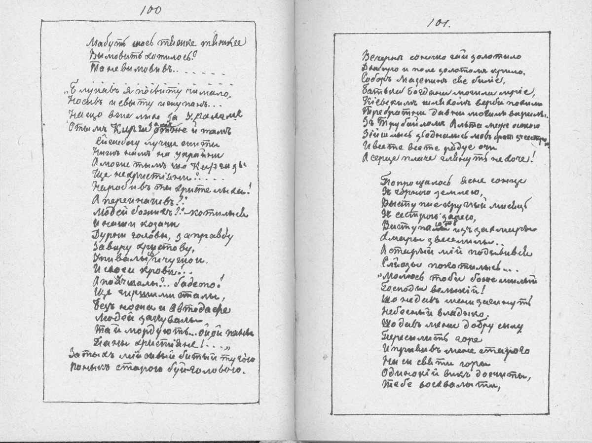 «Мала книжка» Тараса Шевченка. С. 100 – 101 – продовження поезії «Гори мої високії…» з рядка «Мабуть, щось тяжке, тяжкеє…»
