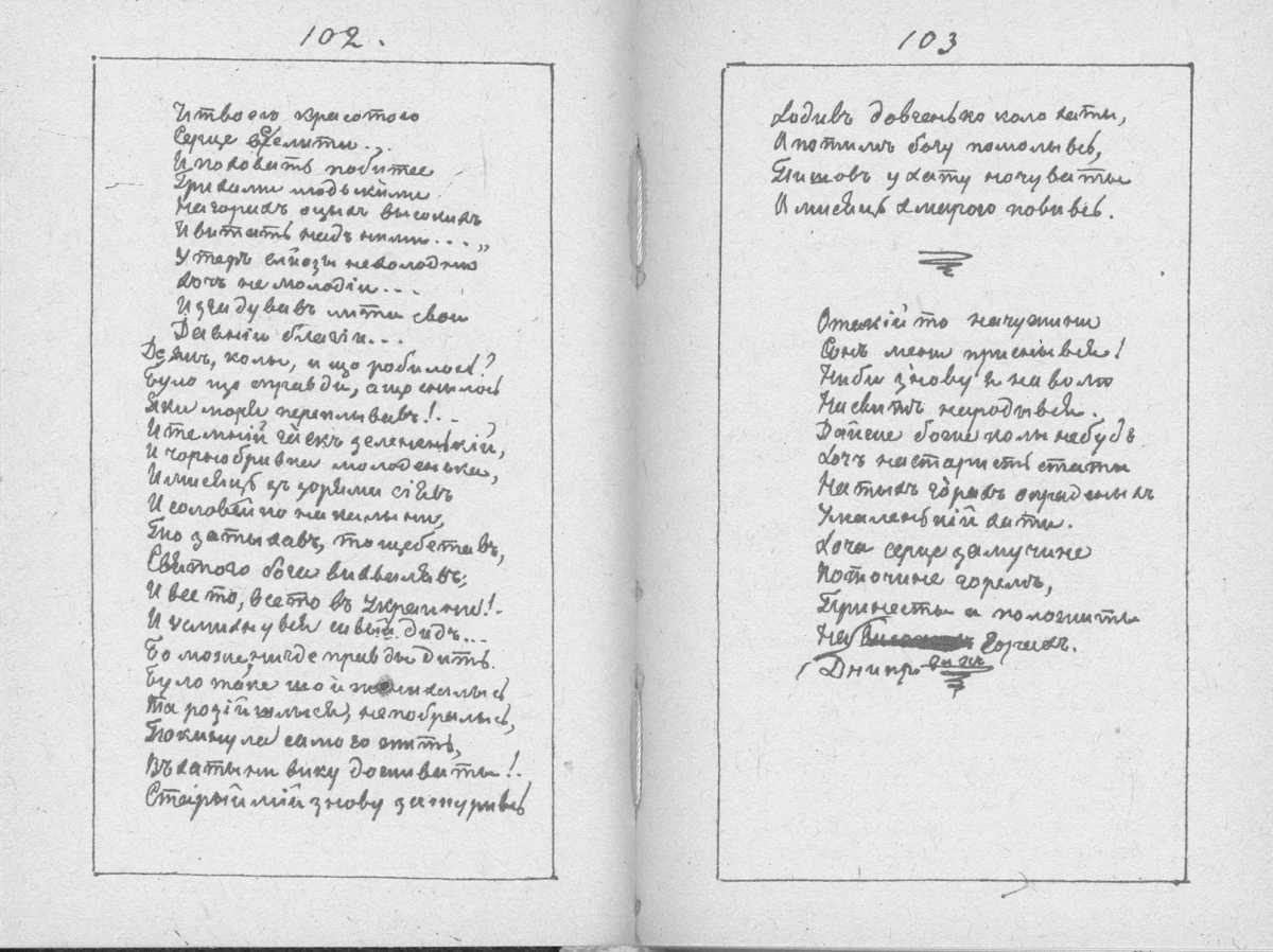 «Мала книжка» Тараса Шевченка. С. 102 – 103 – закінчення поезії «Гори мої високії…» з рядка «І Твоєю красотою…»