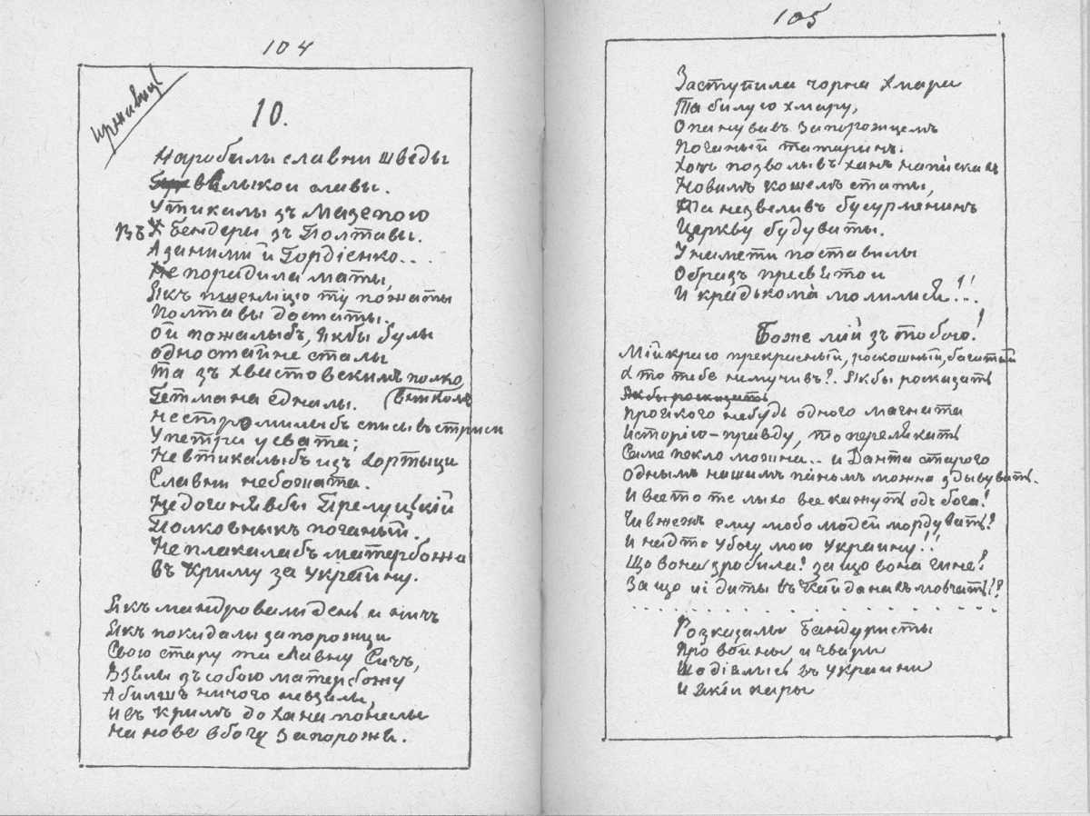 «Мала книжка» Тараса Шевченка. С. 104 – 105 – початок поезії «Іржавець»