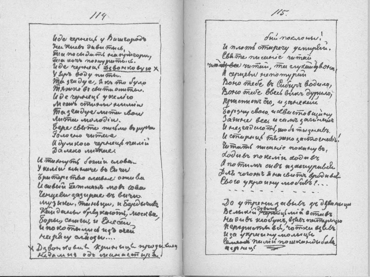 С. 114 – 115 Іде чернець у Вишгород…«Мала книжка» Тараса Шевченка. С. 114 – 115 – продовження поезії «Чернець» з рядка «Іде чернець у Вишгород…» |