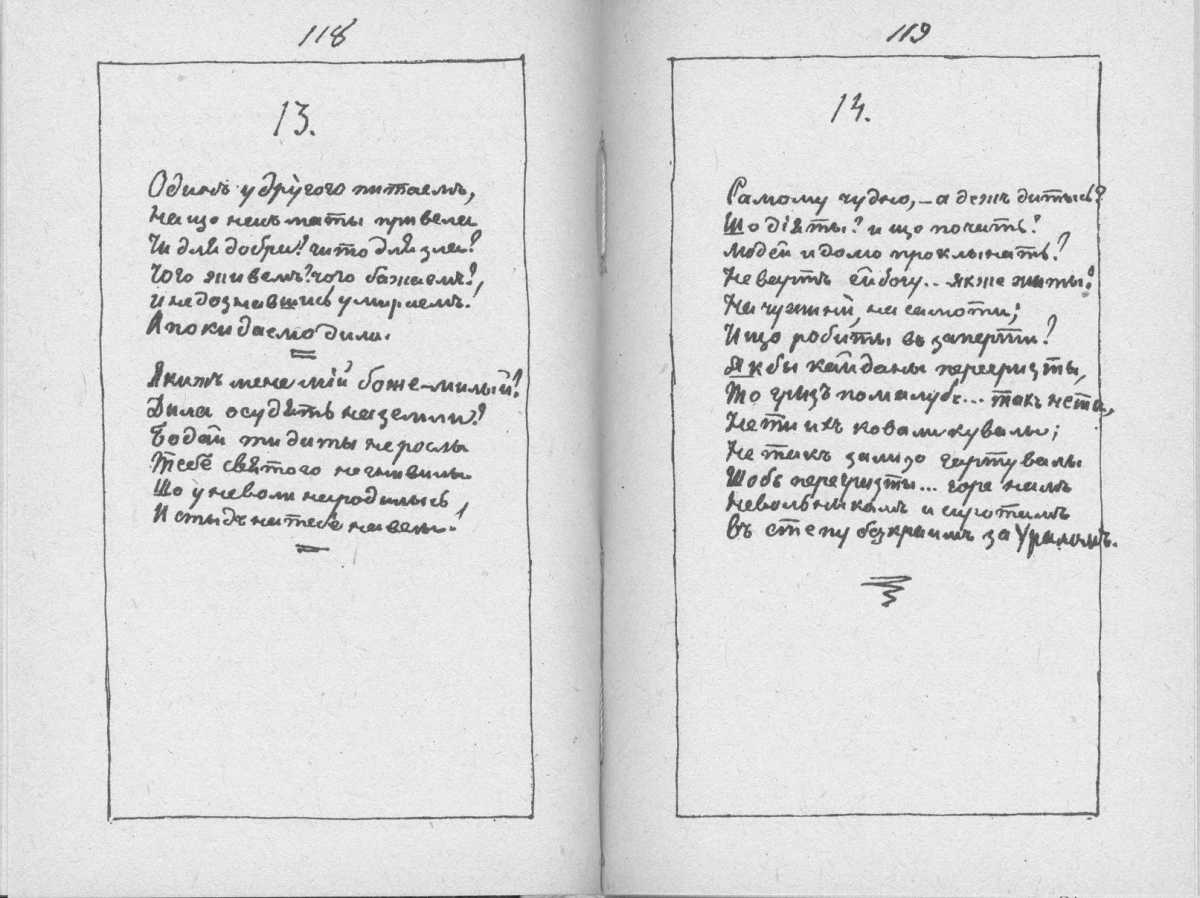 «Мала книжка» Тараса Шевченка. С. 118 – поезія «Один у другого питаєм…»; с. 119 – поезія «Самому чудно. А де ж дітись?…»