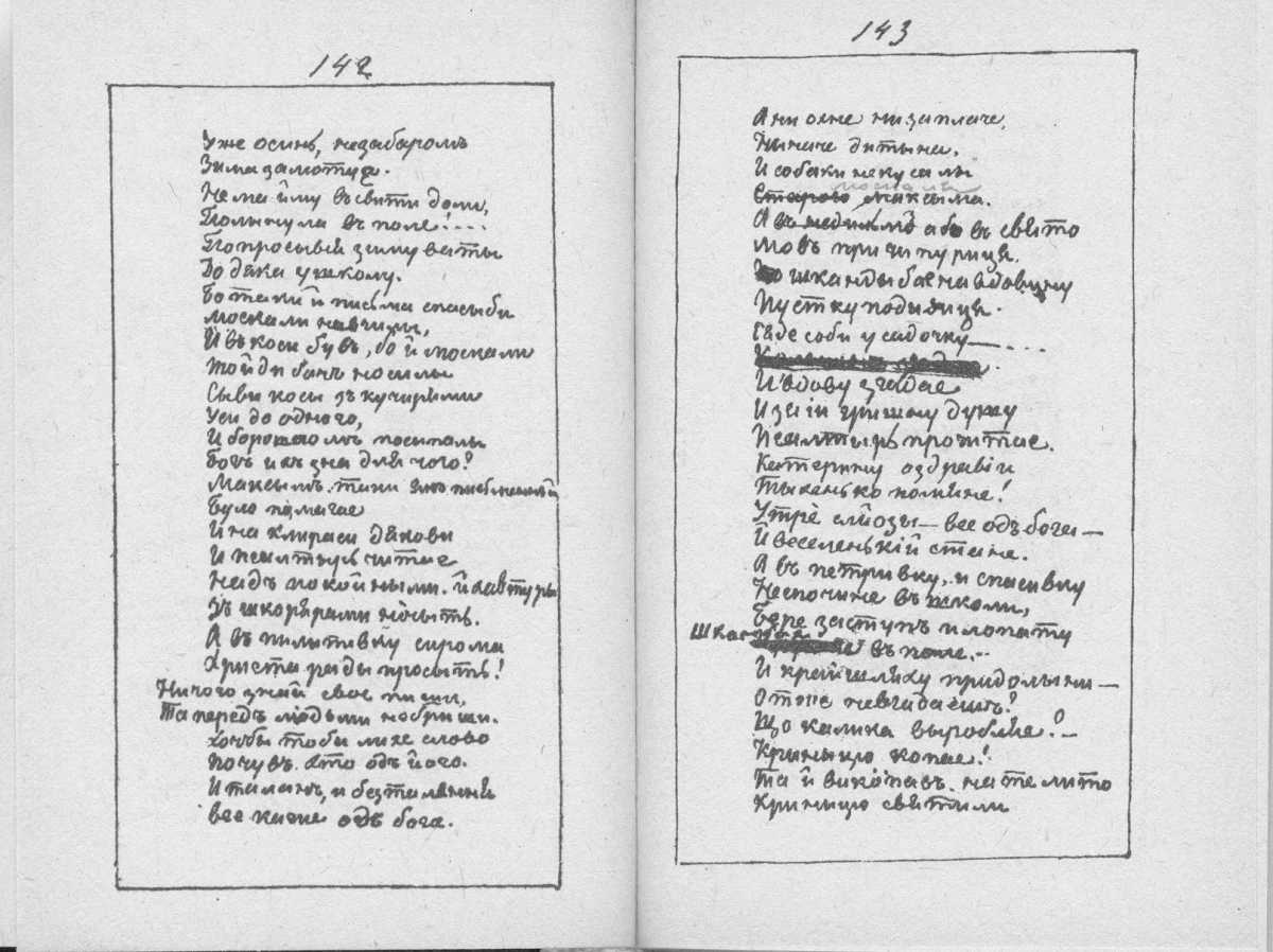С. 142 – 143 Уже осінь, незабаром…«Мала книжка» Тараса Шевченка. С. 142 – 143 – продовження поеми «Москалева криниця» з рядка «Уже осінь, незабаром…» |