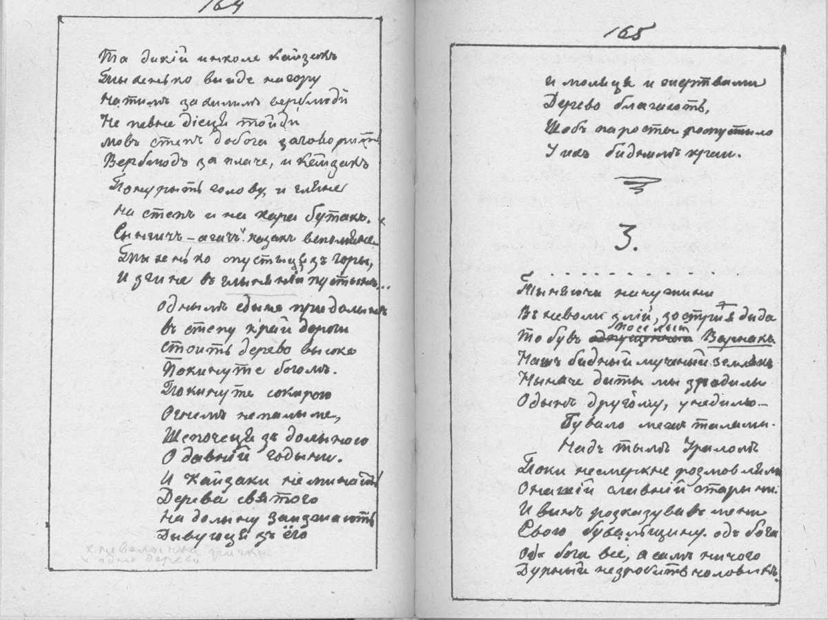 «Мала книжка» Тараса Шевченка. С. 164 – закінчення поезії «У Бога за дверми лежала сокира…» з рядка «Та дикий інколи кайзак…»; с. 165 – початок поеми «Варнак»