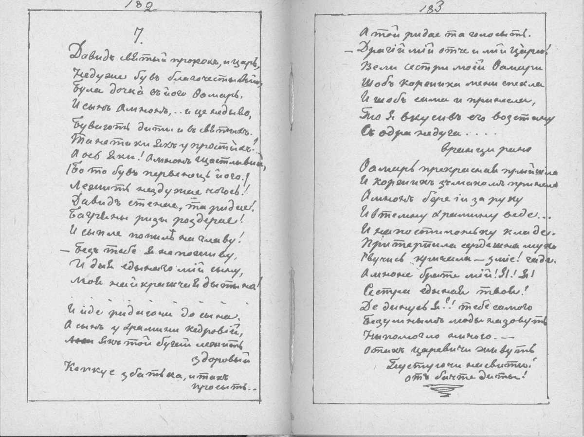 С. 182 – 183 Давид, святий пророк і цар…«Мала книжка» Тараса Шевченка. С. 182 – 183 – продовження циклу «Царі» з рядка «Давид, святий пророк і цар…» |