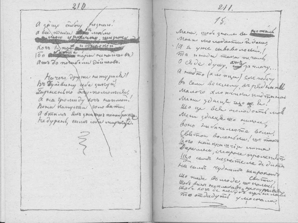 «Мала книжка» Тараса Шевченка. С. 210 – закінчення поезії «Хіба самому написать…» з рядка «А за що, єй-богу, не знаю…»; с. 211 – варіант поезії «І золотої й дорогої…»