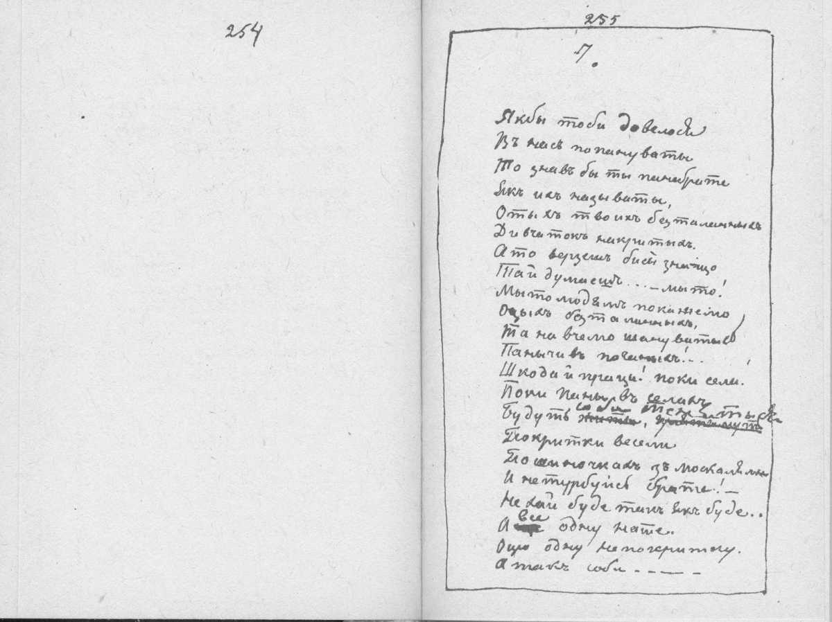С. 254 – 255 Якби тобі довелося…«Мала книжка» Тараса Шевченка. С. 254 – порожня; с. 255 – початок поезії «Якби тобі довелося…» |