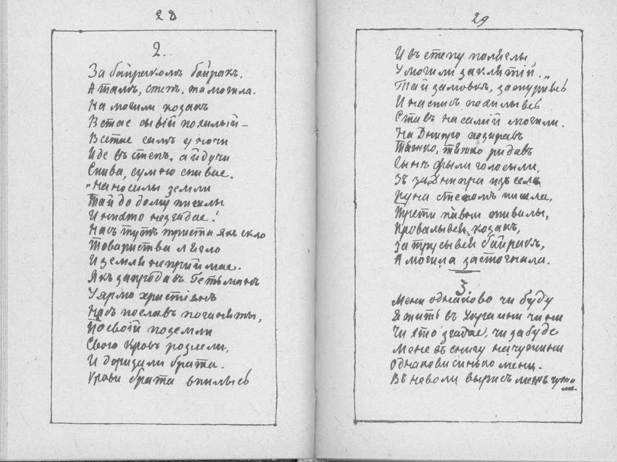 «Мала книжка» Тараса Шевченка. Продовження циклу «В казематі»: с. 28 – поезія «За байраком байрак…»; с. 29 – початок поезії «Мені однаково, чи буду…»