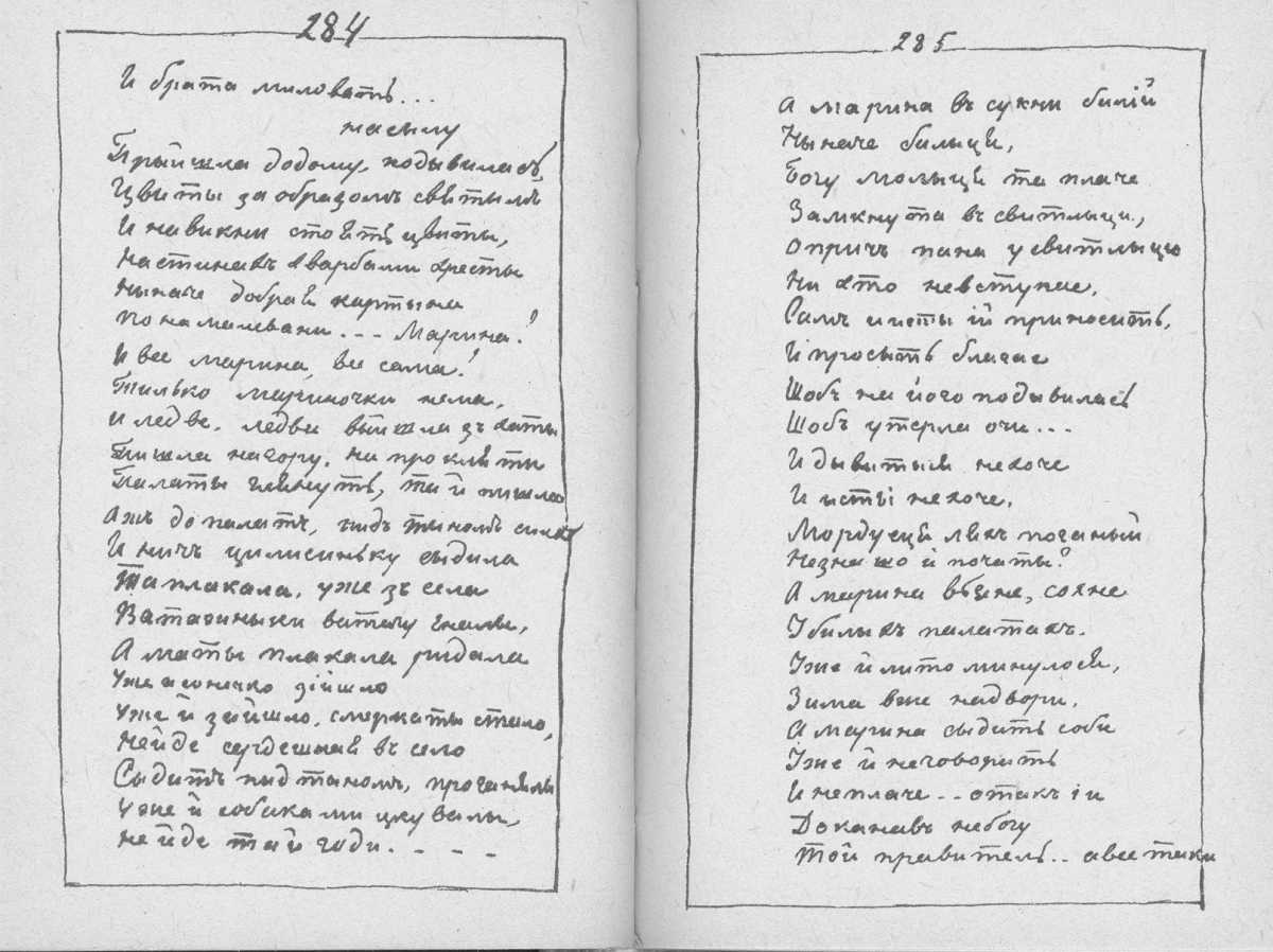 С. 284 – 285 І брата миловать…«Мала книжка» Тараса Шевченка. С. 284 – 285 – продовження поеми «Марина» з рядка «І брата миловать…» |