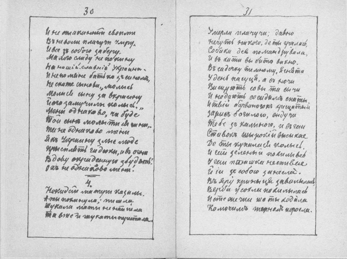С. 30 – 31 Не кидай матері,– казали…«Мала книжка» Тараса Шевченка. Продовження циклу «В казематі»: с. 30 – закінчення поезії «Мені однаково, чи буду…» з рядка «І, неоплаканий своїми…»; с. 31 – початок поезії «Не кидай матері»,– казали…» |