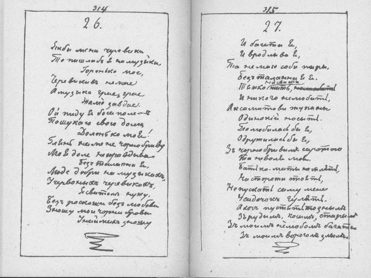 «Мала книжка» Тараса Шевченка. С. 314 – поезія «Якби мені черевики…»; с. 315 – поезія «І багата я…»