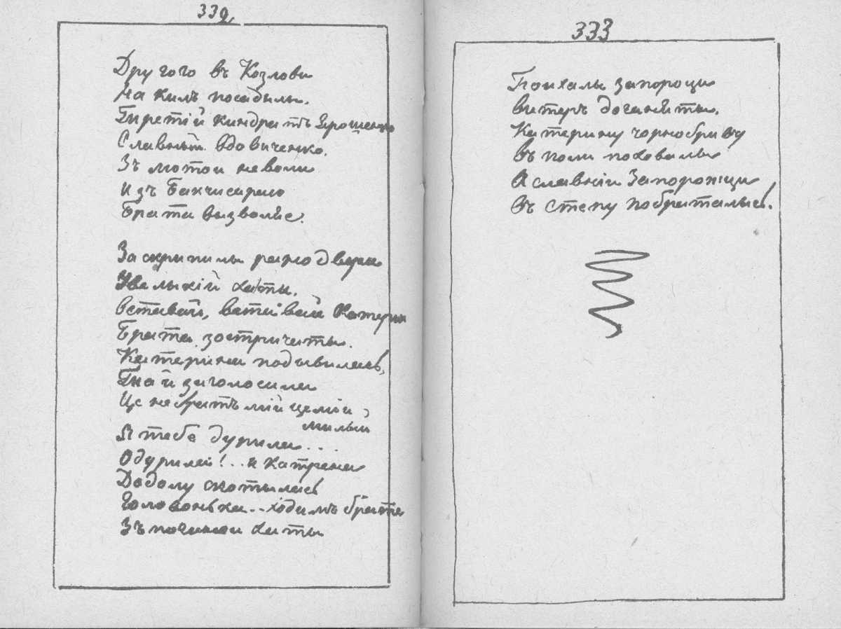 С. 332 – 333 Другого в Козлові…«Мала книжка» Тараса Шевченка. С. 332 – 333 – закінчення поезії «У тієї Катерини…» з рядка «Другого в Козлові…» |
