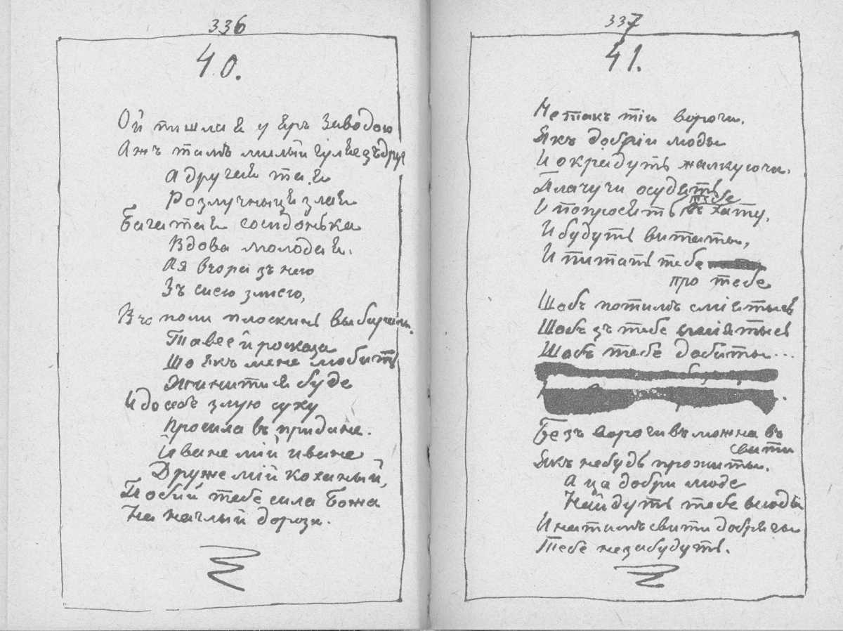 «Мала книжка» Тараса Шевченка. С. 336 – поезія «Ой пішла я у яр за водою…»; с. 337 – поезія «Не так тії вороги…»