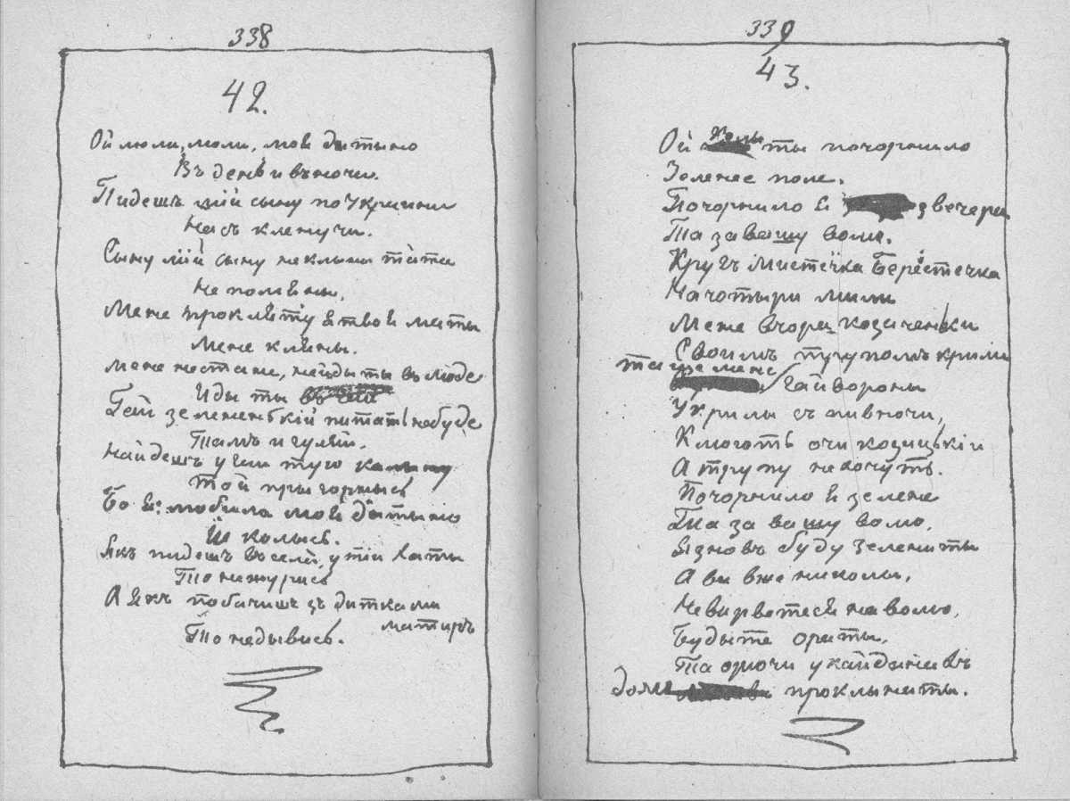 «Мала книжка» Тараса Шевченка. С. 338 – поезія «Ой люлі, люлі, моя дитино…»; с. 339 – поезія «Ой чого ти почорніло…»