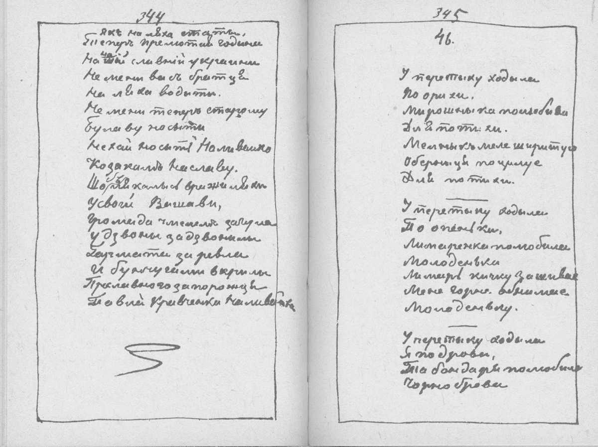 «Мала книжка» Тараса Шевченка. С. 344 – закінчення поезії «У неділеньку у святую…» з рядка «Як на ляха стати…»; с. 345 – початок поезії «У перетику ходила…»