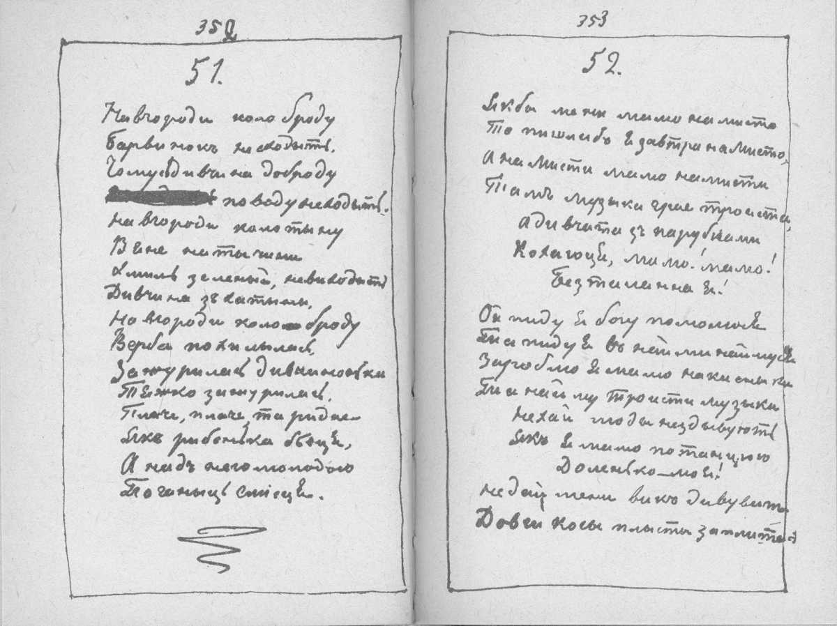 «Мала книжка» Тараса Шевченка. С. 352 – поезія «Навгороді коло броду…»; с. 353 – початок поезії «Якби мені, мамо, намисто…»
