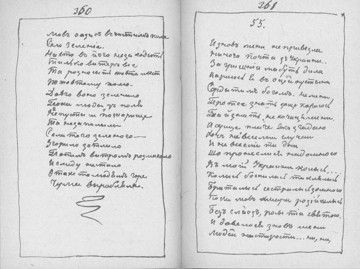 «Мала книжка» Тараса Шевченка. С. 360 – закінчення поезії «Чума» з рядка «Мов оазис, в чистім полі…»; с. 361 – початок поезії «І знов мені не привезла…»