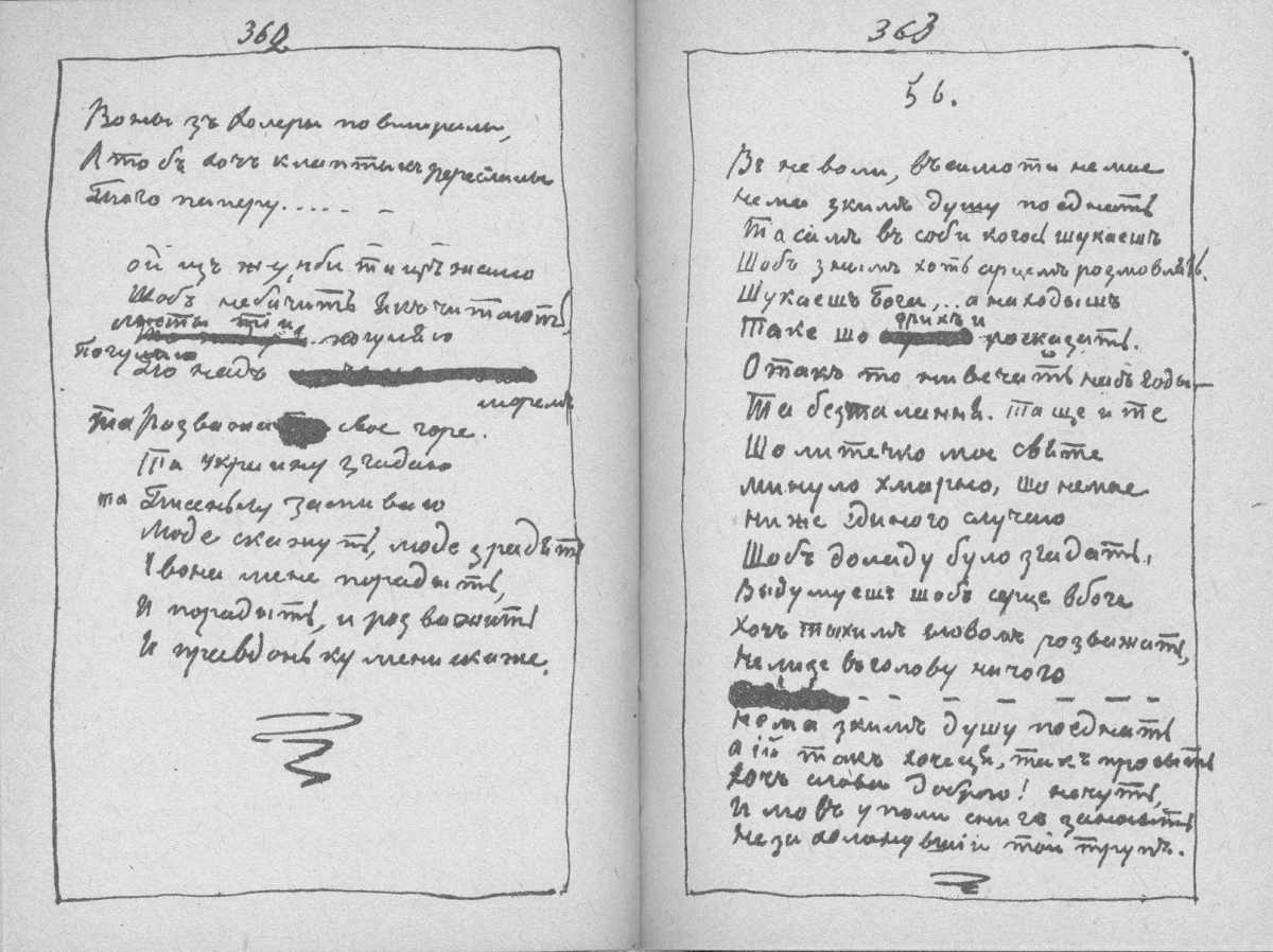 «Мала книжка» Тараса Шевченка. С. 362 – закінчення поезії «І знов мені не привезла…» з рядка «Вони з холери повмирали…»; с. 363 – поезія «В неволі, в самоті немає…»