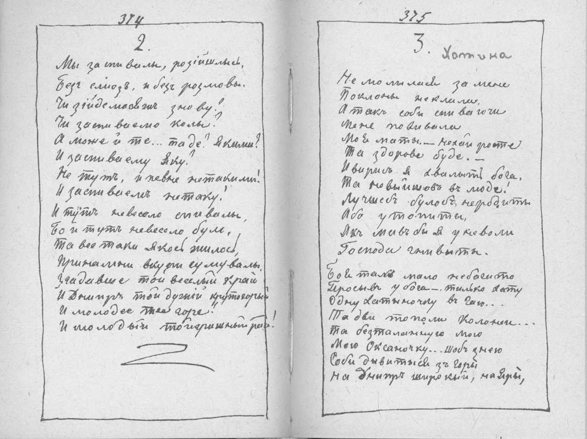 С. 374 – 375 Не молилася за мене…«Мала книжка» Тараса Шевченка. С. 374 – поезія «Ми заспівали, розійшлись…»; с. 375 – початок поезії «Не молилася за мене…» |