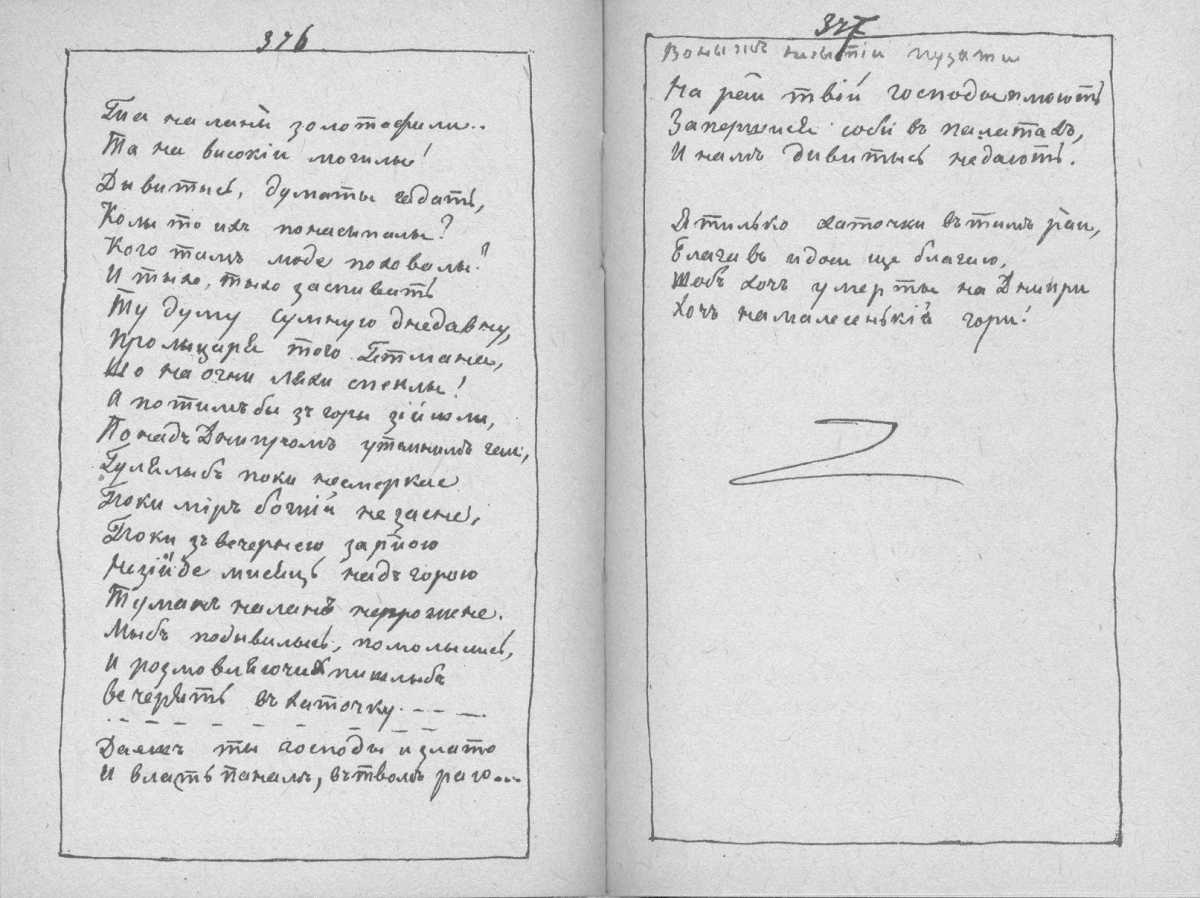 С. 376 – 377 Та на лани золотополі…«Мала книжка» Тараса Шевченка. С. 376 – 377 – закінчення поезії «Не молилася за мене…» з рядка «Та на лани золотополі…» |