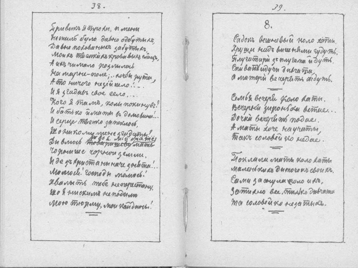 «Мала книжка» Тараса Шевченка. Продовження циклу «В казематі»: с. 38 – закінчення поезії «Н. Костомарову» з рядка «Привик я трохи, і мені…»; с. 39 – поезія «Садок вишневий коло хати…»