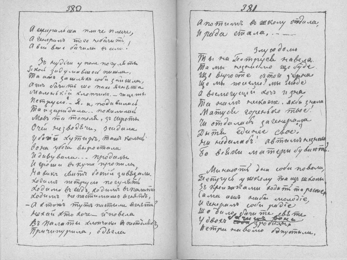 «Мала книжка» Тараса Шевченка. С. 380 – 381 – продовження поеми «Петрусь» з рядка «А генеральша плаче, плаче…»