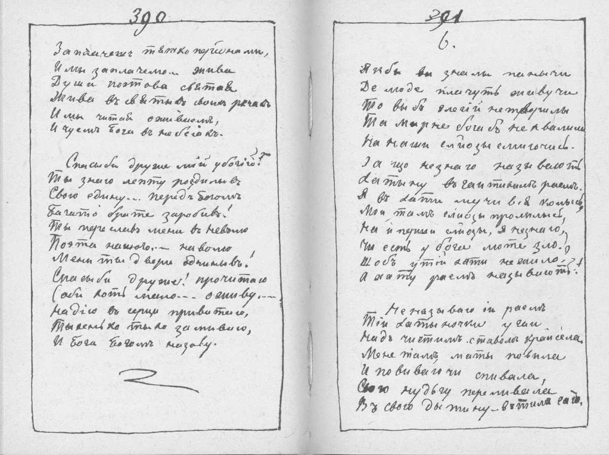 «Мала книжка» Тараса Шевченка. С. 390 – закінчення поезії «Мені здається, я не знаю…» з рядка «Заплачеш тяжко перед нами…»; с. 391 – початок поезії «Якби ви знали, паничі…»