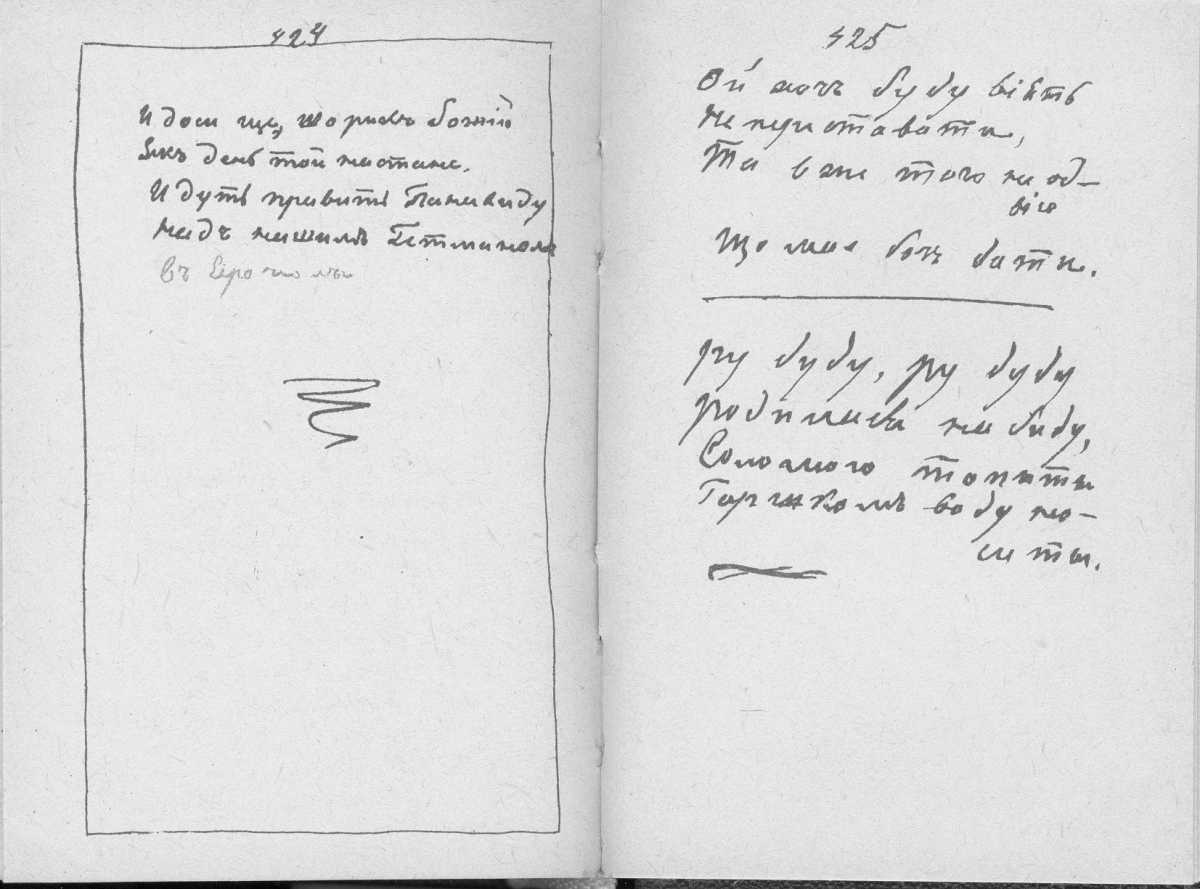 С. 424 – 425 Ой хоч буду віять…«Мала книжка» Тараса Шевченка. С. 424 – закінчення поезії «Заступила чорна хмара…» з рядка «І досі ще що рік Божий…»; с, 426 – записи народних пісень «Ой хоч буду віять…» та «Ру-дуду, ру-дуду…» |