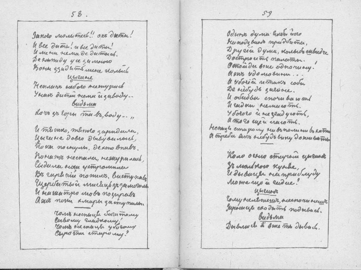 С. 58 – 59 За кого молитесь!! Ох, діти…«Мала книжка» Тараса Шевченка. С. 58 – 59 – продовження поеми «Відьма» з рядка «За кого молитесь!! Ох, діти…» |