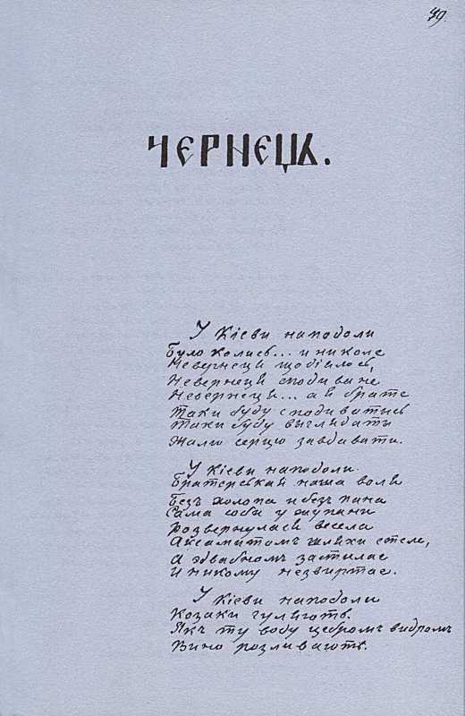 «Більша книжка» Тараса Шевченка. С. 49 – початок поезії «Чернець» |