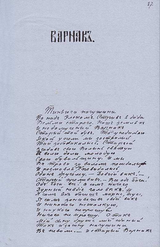 «Більша книжка» Тараса Шевченка. С. 87 – початок поеми «Варнак»