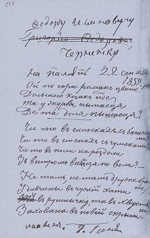 «Більша книжка» Тараса Шевченка. С. 238 – поезія Твір переписано невідомою рукою, виправлення – рукою Шевченка. |