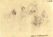 На сторінці тематично та композиційно не пов’язані між собою зарисовка, ескізи та начерки. Постать художника перед мольбертом – найбільш опрацьована. Ліворуч від неї жанрова сцена. Праворуч по краю сторінки начерки профілів, подібних до зображених на рисунку «На лекції І.В. Буяльського з остеології», виконаному 1841 р. Нижче ескіз невстановленого сюжету та начерк постаті одного з гостей до ілюстрації «Святкові розваги», вміщеної у третьому випуску книжки М.О. Полевого «Історія Суворова», ілюстрації до якого готувалися 1842 р.